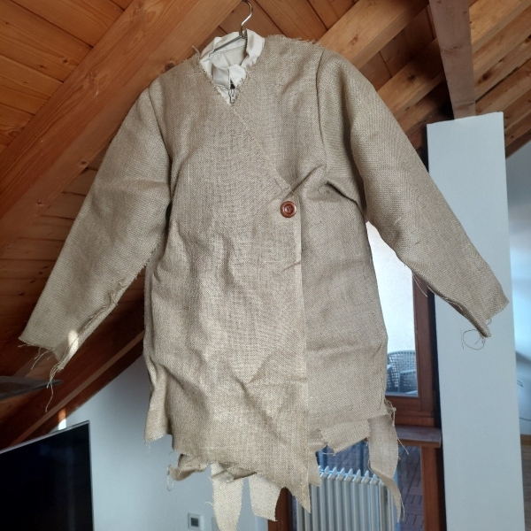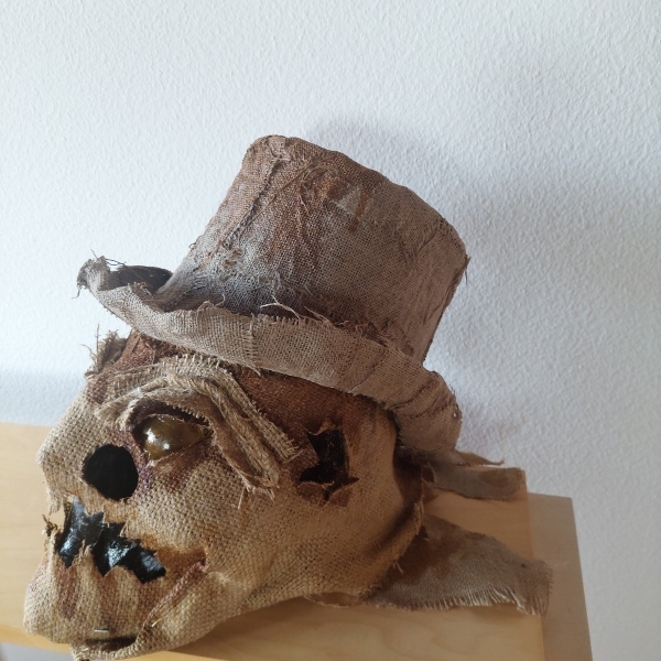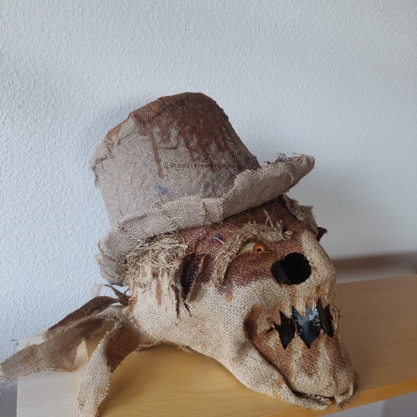 Zum Verkauf steht eine ausdrucksstarke, grimmige Fasnachtslarve im Vogelscheuchen- / Horror-Stil inklusive passendem Kostümoberteil.