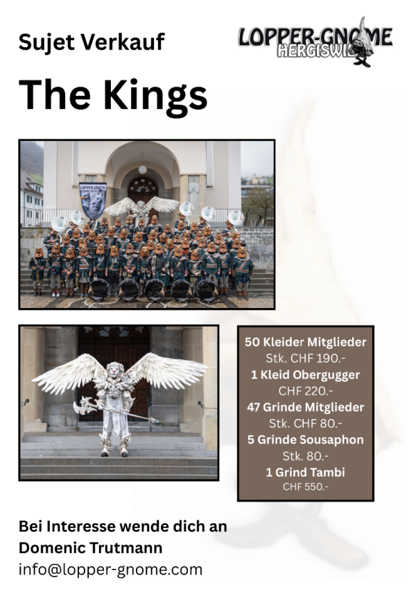 Das Sujet The Kings umfasst Total 50 Kleider für Mitglieder, 1 Kleid für den Obergugger, 47 Grinde für Mitglieder, 5 Grinde für Sousaphone und 1 Obergugger-Grind.