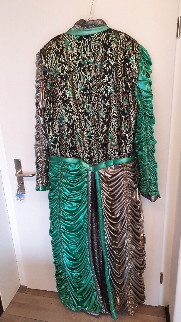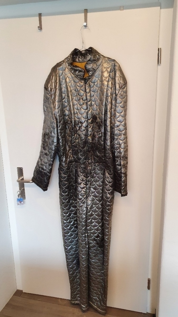 Das Kostüm wurde mit viel Liebe für eine Person einer Guggenmusik genäht. Es wurde nur eine Saison getragen. Der Overall wurde mal eine Woche ausgeborgt und kam leider sehr abgetragen zurück. Er kann auch weggelassen werden. Man kann das Kleid auch gut ohne die Schulterpatten/Epauletten tragen.